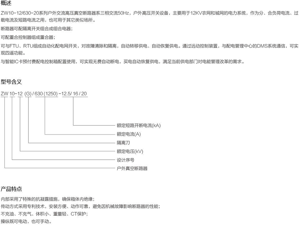 ZW10- 12/630-20系列戶外交流高壓真空斷路器系三相交流50Hz,戶外高壓開關(guān)設(shè)備,主要用于12KV農(nóng)網(wǎng)和城網(wǎng)的電力系統(tǒng),作為分、合負荷電流、過載電流及短路電流之用,也可用于其它類似場所。